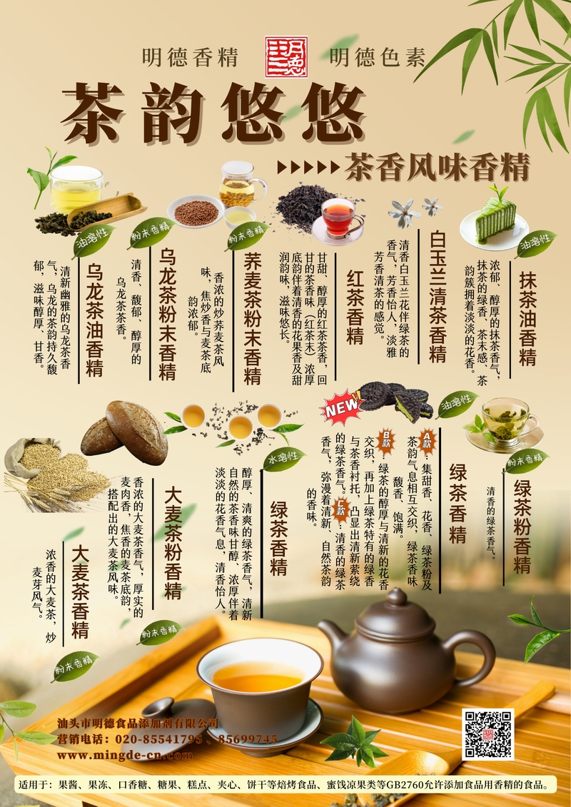汕頭市明德食品添加劑有限公司推出的茶香風味系列香精,涵蓋烏龍茶、蕎麥茶、紅茶、白玉蘭清茶、抹茶、大麥茶、綠茶等多種茶類調性,滿足飲品、烘焙、糖果、乳制品、調味品等多領域的茶香需求,為B端客戶提供穩(wěn)定、真實的茶韻香氣解決方案。